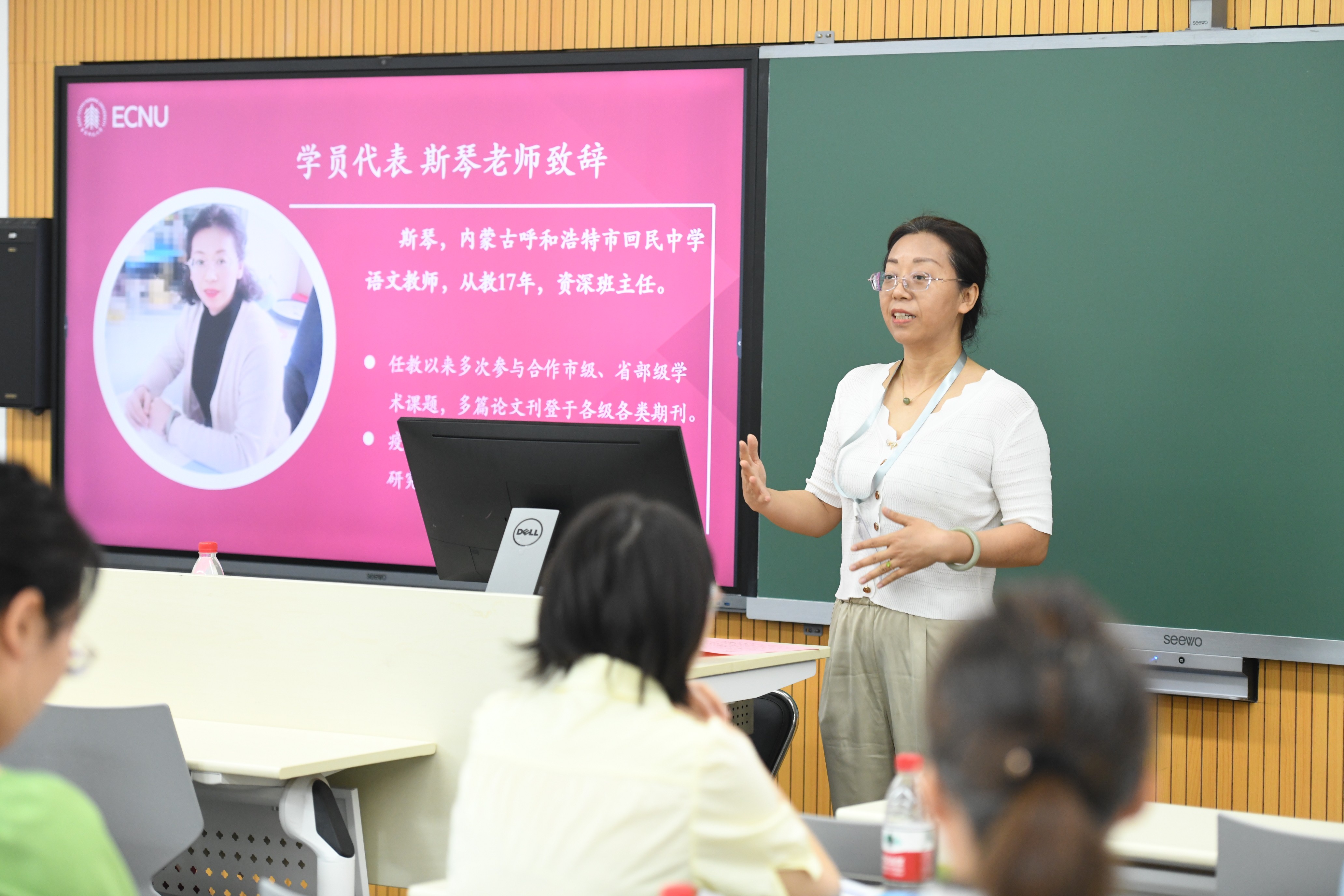 7月24日,华东师大麻豆传媒 党委书记吕志峰出席开班仪式并致欢迎辞,他表示,希望各位研修的老师都能不虚此行,于学习、交流中开拓思路、互通有无,以“整本书”为切入点,共谋语文教育新发展。开班仪式上,来自内蒙古呼和浩特市回民中学的资深语文教师斯琴老师作为学员代表发言,对五天的研修表达了期待。