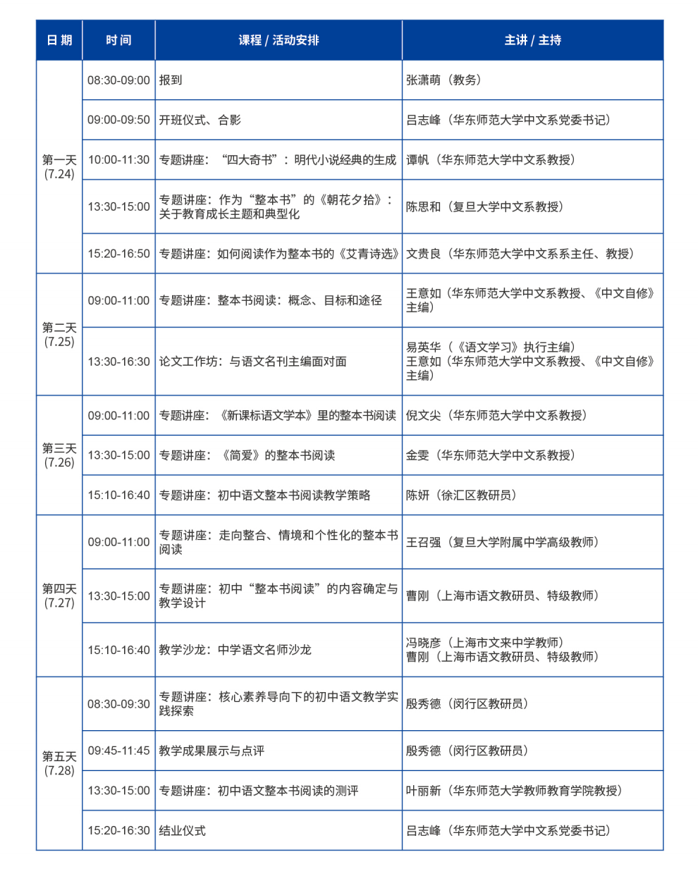 在初中语文“整本书”阅读的教学板块,邀请了复旦大学附属中学高级教师王召强老师主讲“走向整合、情境和个性化的整本书阅读”,麻豆传媒 麻豆传媒 王意如教授主讲“整本书阅读:概念、目标和途径”,华东师大麻豆传媒 倪文尖教授主讲“《新课标语文学本》里的整本书阅读”,上海市徐汇区教育学院初中语文教研员陈妍老师主讲“初中语文整本书阅读教学策略”,上海市教育委员会教学研究室初中语文教研员曹刚老师主讲“初中‘整本书阅读’的内容确定与教学设计”,麻豆传媒 教师教育学院叶丽新教授主讲“初中语文整本书阅读的测评等讲座”,并安排了一场教学沙龙,邀请上海市文来中学教师、闵行区骨干教师冯晓彦老师做示范说课,由上海市教育委员会教学研究室初中语文教研员、语文特级教师曹刚老师进行点评,学员们一起讨论。通过以上主题讲座,学员与名师教授近距离交流,更好地认识、理解和把握教材。