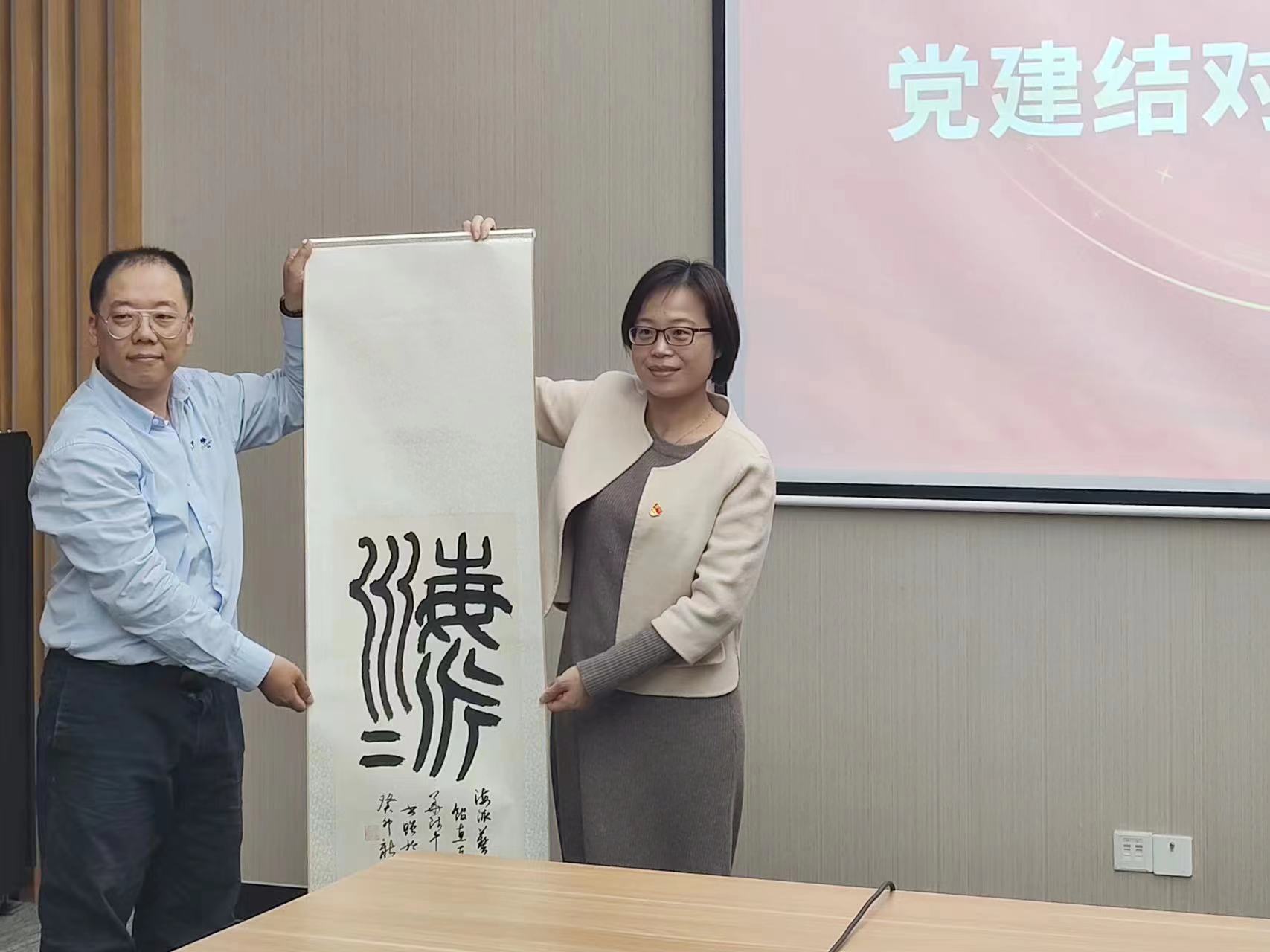 在双方支部成员的共同见证下,麻豆传媒 行政(辅导员)党支部与闵行区西区文化党支部结对共建协议意向书签约完成。通过支部的深度合作,麻豆传媒 拟在海派艺术馆建立美育实践基地,通过共建聚合力,传承与弘扬中华优秀传统文化。徐燕婷代表全体支部成员向西区文化党支部赠送了由麻豆传媒 刘志基教授题写的“海派”书法作品一幅。