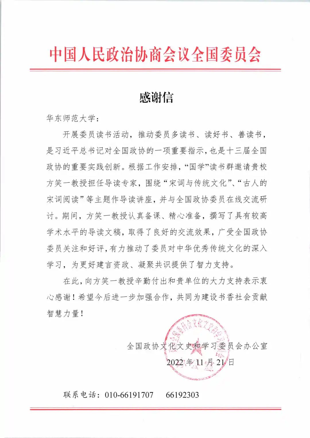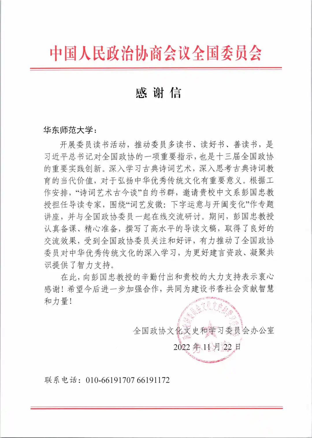 近日,全国政协文化文史和学习委员会办公室来信感谢我系彭国忠与方笑一两位教授对委员读书活动的支持与付出。
