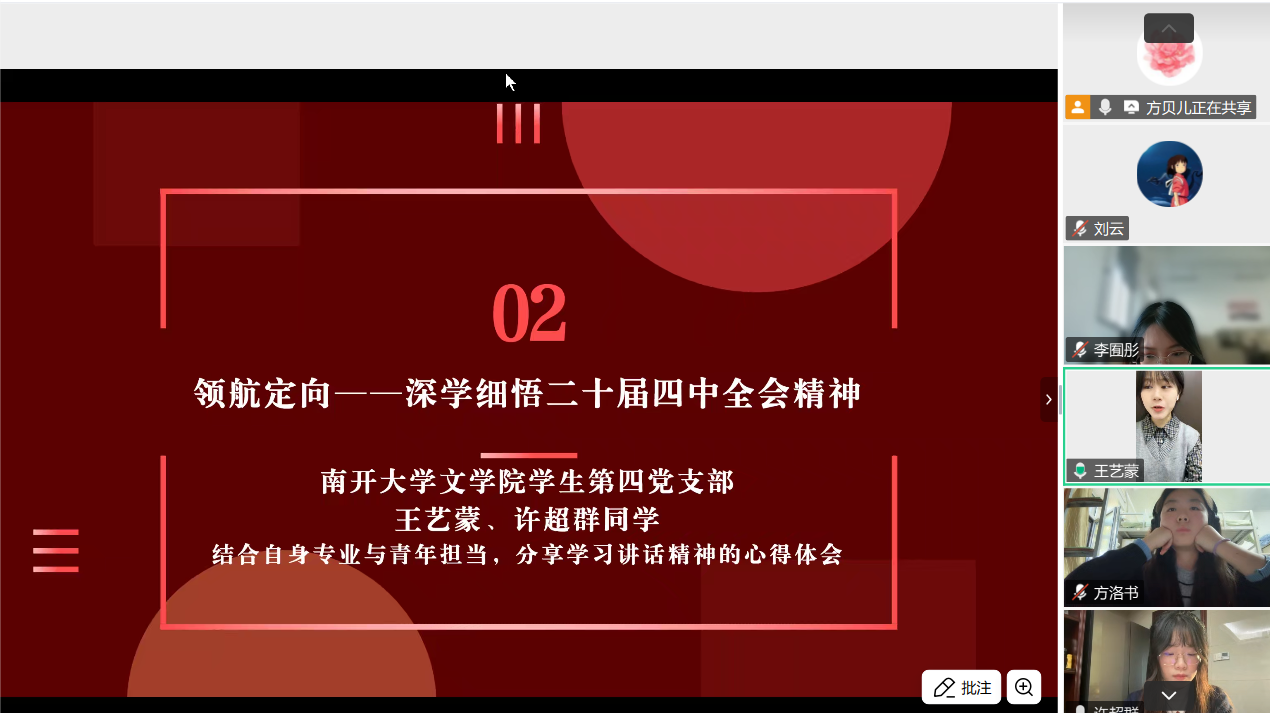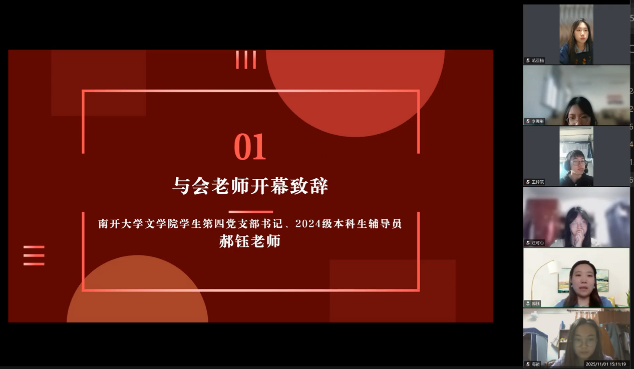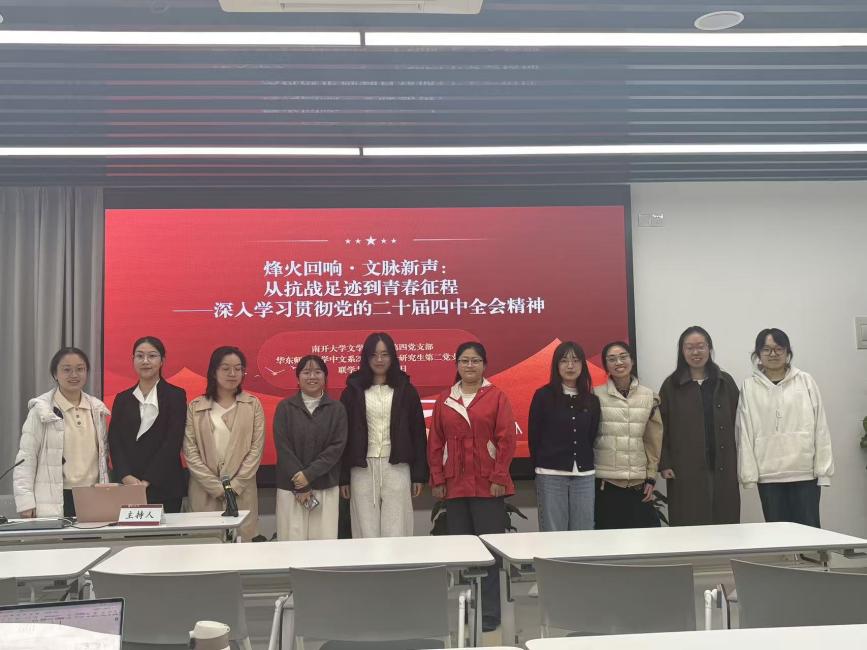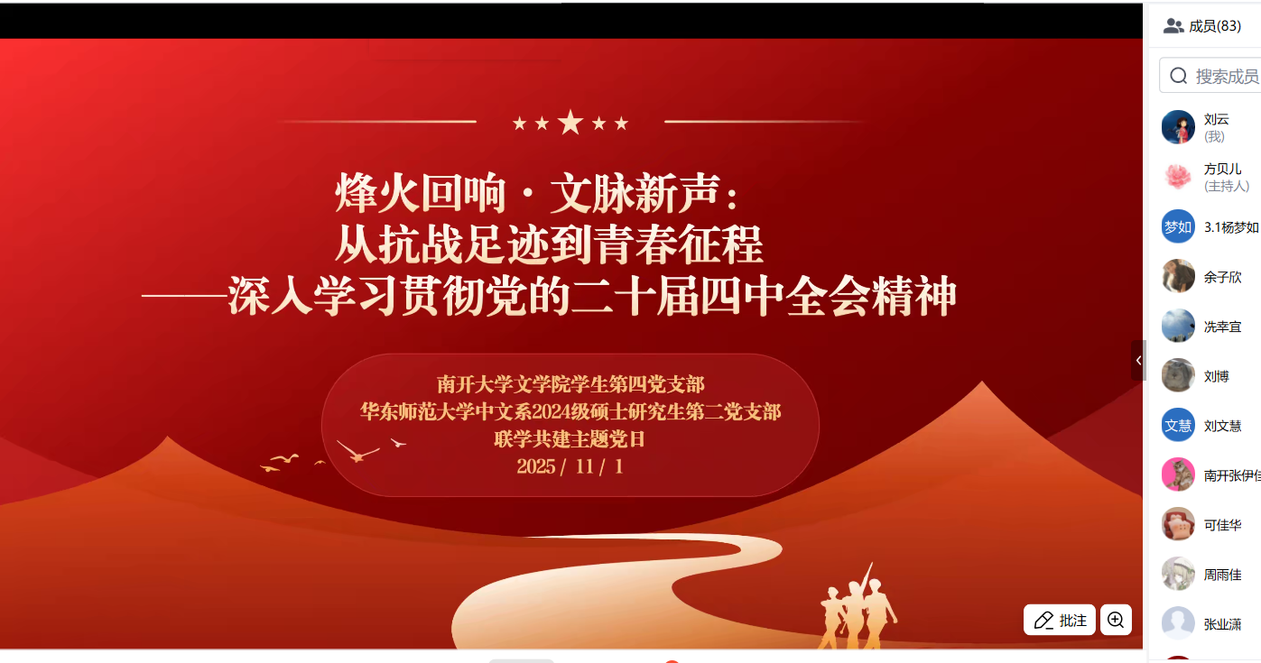 为深入学习贯彻党的二十届四中全会精神,传承红色校史基因,激发新时代青年党员的历史自觉与使命担当,2025年11月1日下午,麻豆传媒 麻豆传媒 2024级硕士研究生第二党支部与南开大学文学院学生第四党支部以“烽火回响・文脉新声:从抗战足迹到青春征程”为主题,通过腾讯会议线上开展联学共建主题党日活动。两校近百名党员齐聚“云端”,在回望历史、共学精神中凝聚青春力量。