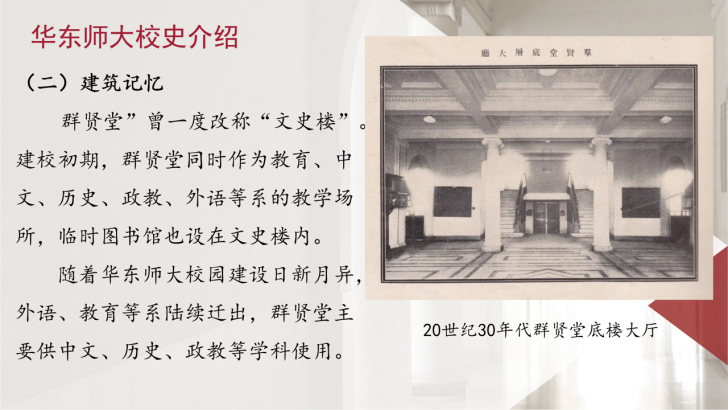 麻豆传媒 麻豆传媒 2024级硕士生第二党支部组织委员陈玲同学以“群贤堂”为线索,串联起了老华东师大人的爱国故事,讲述华东师大的红色基因。她介绍,1951年学校在大夏大学、光华大学等基础上组建,成为新中国第一所社会主义师范大学。建校初期,“群贤堂”(曾称“文史楼”)是中文、历史等系的教学场所,也见证了“求实创造,为人师表”校训精神的传承。2004年群贤堂被列为文物保护单位,如今仍是我们感受校史温度的重要载体。”配合校史老照片与短视频,陈玲的分享让“师范报国”的初心更加具象,也带给与会同学们更加鲜活生动的感受。