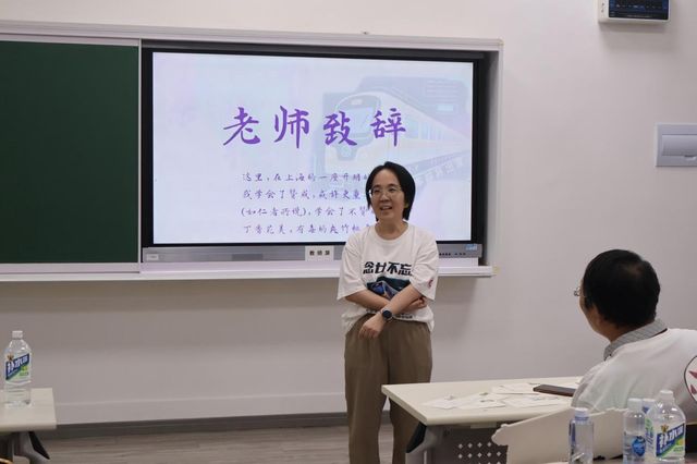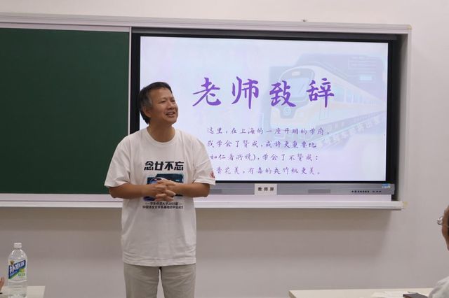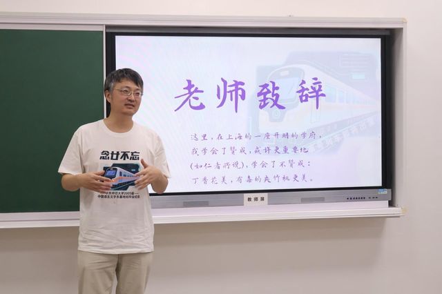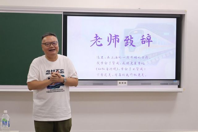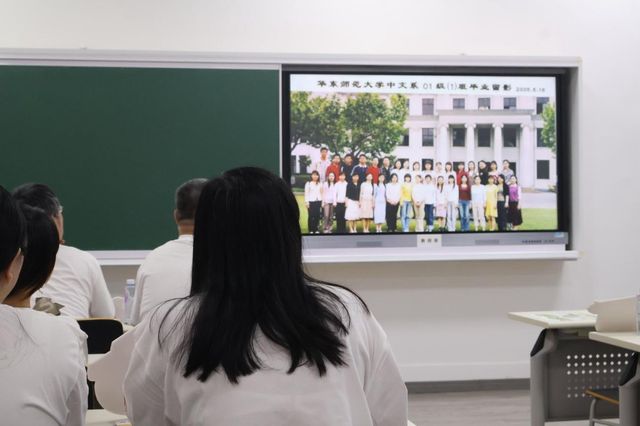 班会以念“廿”不忘为主题,由一支回忆短片开场。短片里,二十年前的老照片和老师们熟悉的话语穿梭至眼前,二十年来沉淀的情谊也涌入人心。同窗寄语环节,系友们纷纷上台,诵读会前准备好的寄语。他们诉说在文史楼的温馨回忆,细数和师长、同学们的过往,讲述“爱在华师大”给予他们的人生意义。
