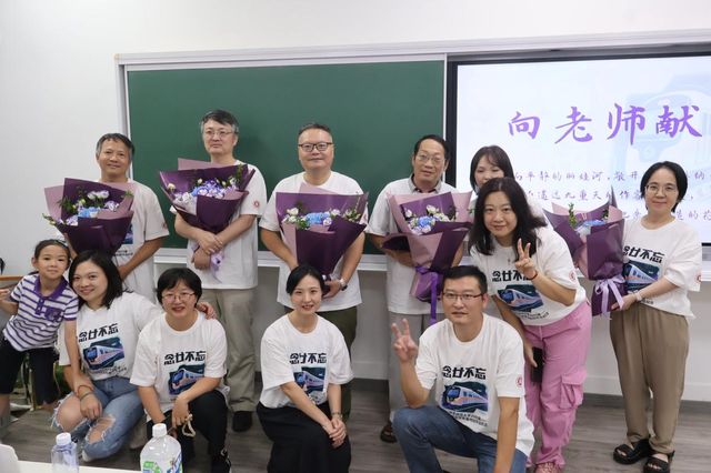 活动的最后,05届系友共同为老师们献上鲜花,多年未见的老师、同学们共同留影纪念。